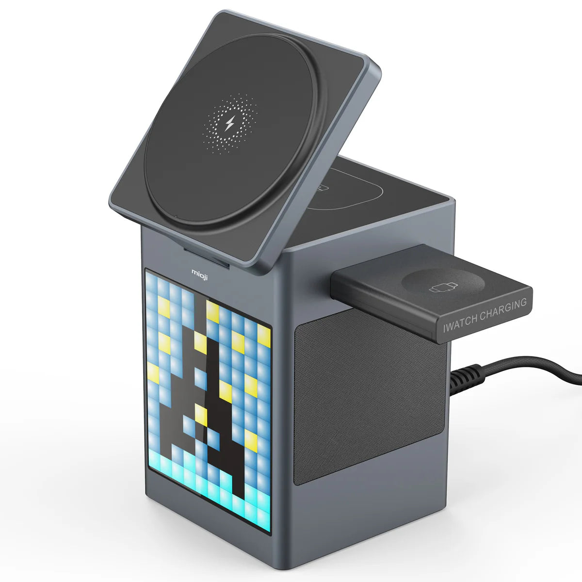 Die Ladestation ist mit den meisten Telefonen (iOS, Android, Windows) kompatibel. Sie unterstützt schnelles Laden für Apple-Geräte wie die iPhone 15er-Serie, Apple Watch und AirPods Pro mit kabellosem Gehäuse.